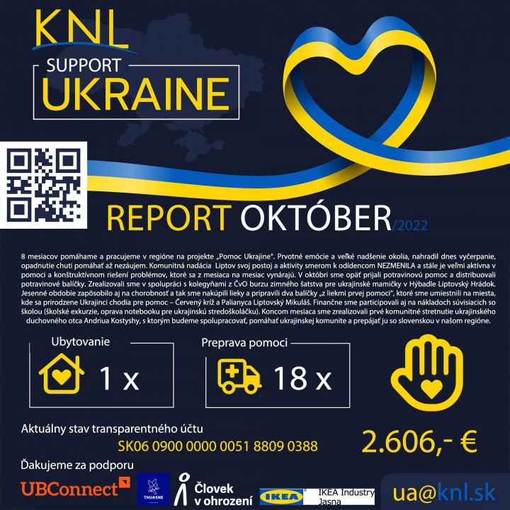 Aj v októbri stále pokračujeme v programe "Pomoc Ukrajine". V mesačnom reporte sa dozviete čo konkrétne sme urobili a komu pomohli.