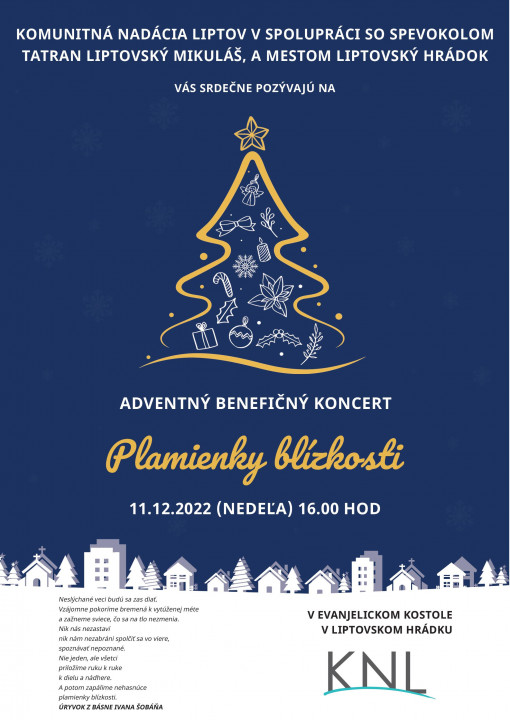 Benefičný adventný koncert „Plamienky blízkosti“ sa niesol nielen v duchu čarovného spevu speváckeho zboru Tatran Liptovský Mikuláš pod vedením Ľubomíra Rašiho, ale aj stíšenia a poďakovania za pomoc blížnemu. Koncert nám krásnymi slovami otvoril primátor mesta Branislav Tréger. Komunitná nadácia Liptov sa rozhodla v rámci koncertu poďakovať tím, ktorí popri svojej každodennej práci pamätajú na blížnych v núdzi a venujú im svoju nezištnú pomoc. Rodiny Plachtinských a Belániovcov, ktorí okolo seba združili ďalších dobrovoľníkov prevažne z cirkevných zborov a dodnes pomáhajú ukrajinským odídencom, ktorí našli svoje útočisko v Jánoškovom dome. Naša vďaka patrila aj pani Evke Ohraďanovej, ktorá v rámci svojho ubytovania Hýbadlo vyčlenila priestor, kde dodnes v bezpečí býva viac ako 40 ľudí. Tu je pre nich oporou a anjelom strážnym pani Lenka Trepáčová. A práve týmto ľuďom sme na koncerte verejne poďakovali a zaznelo aj vrúcne poďakovanie za celú komunitu Ukrajincov, žijúcich na Liptove.