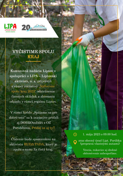 Dobrovoľníci z KNL, LIPA - Liptovskí aktivisti, o.z., dobrovoľní hasiči z Liptovskej Porúbky a Liptovského Hrádku, dobrovoľníci z obce Liptovská Porúbka, OZ Porubčania a decká z Centrum pre deti a rodiny Liptovský Hrádok pod vedením Jakuba Moravčíka. Takáto skvelá partia odstránila niekoľko čiernych skládok v katastry Obce Lipt. Porúbka, Liptovský Hrádok aj Liptovský Mikuláš.
