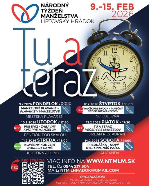 Národný týždeň manželstva v Liptovskom Hrádku sa v roku 2026 uskutoční v termíne 9. – 15. februára a prinesie sériu podujatí zameraných na posilnenie manželských vzťahov, spoločný čas a vzájomnú blízkosť. Tohtoročná téma „Tu a teraz“ pozýva manželov zastaviť sa, byť prítomní jeden pre druhého a vedome investovať do svojho vzťahu uprostred každodenného zhonu.