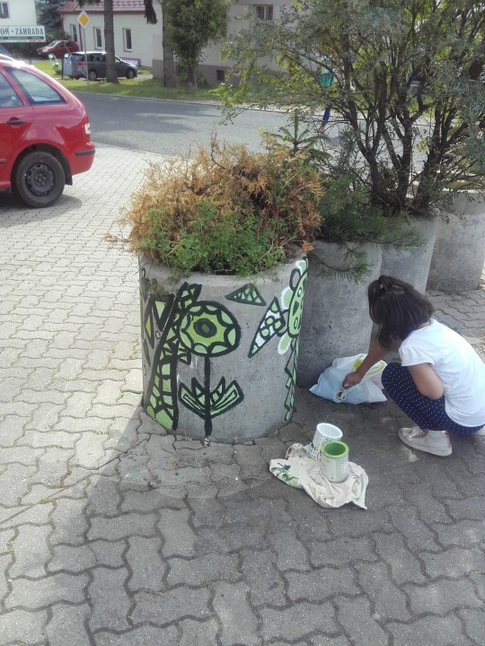 Výtvarníci naštartovali komunitné dni dobrovoľníctva, ktoré v meste Liptovský Hrádok organizuje Komunitná nadácia Liptov v spolupráci s rôznymi subjektami. 15 detí zo Súkromnej základnej umeleckej školy z Liptovského Mikuláša s pani učiteľkou a maminami začali na UL. SNP v pondelok 20.6.2016 maľovať kvetináče. Budú pokračovať celý týždeň.
